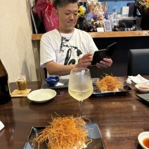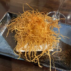 この真丈は目の前に置かれて驚いたのは、細く切られた春巻きの皮を揚げてあるもので覆われていて、中身は、摺り下ろされているエビと、ミジンにされたエビ、歯応えがあるエビと三層になっている。