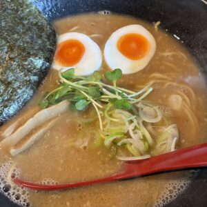 14時過ぎに、やっとお昼ごはん。しばちゃんのところで『軟骨らーめん』をいただきましたが、私はチャーシュー無しの代わりに玉子入り!しばちゃんに「ドラえもんに見えるよね!